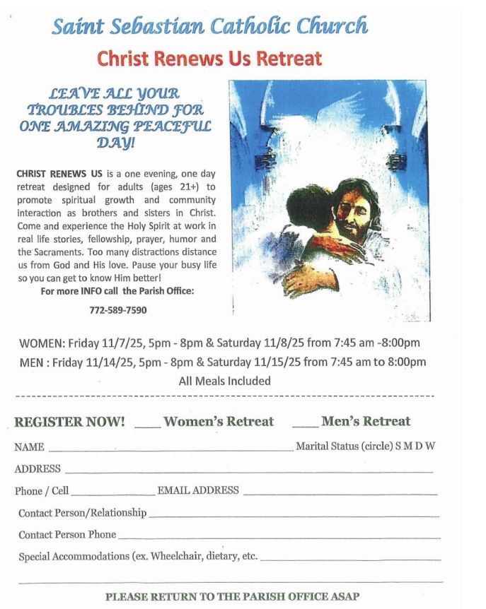 "Christ Renews Us" (CRU) is a one-day par-ish retreat, open to every adult member (age 21+) of St. Sebastian Catholic Community (including non-Catholic spouses, etc.) where you will experience a personal, spiritual re-newal and an abundance of joy in Christian Community. CRU is a process designed to bring members of our parish together in Christ. It consists of two gifts. The first is a 'gift' of the day to you where you "come away" from the everyday world for a time of listening, sharing, prayer, fun and food! The second is your 'gift' to others where you simply take your renewed heart into your everyday life.The retreat, is given by a team of Parishion-ers, like you, along with a Priest/Deacon who have come together to prepare this 'gift' for you. Men and women attend separate week-ends. This is not a silent retreat. The empha-sis is on personal and community renewal. The process is centered on the sharing of God's love by members of the Team and table sharing in a liturgical, scriptural, prayerful & casual atmosphere. There will be no pressure on you to talk or share. Sensitivity to you and your needs will always be respected.
