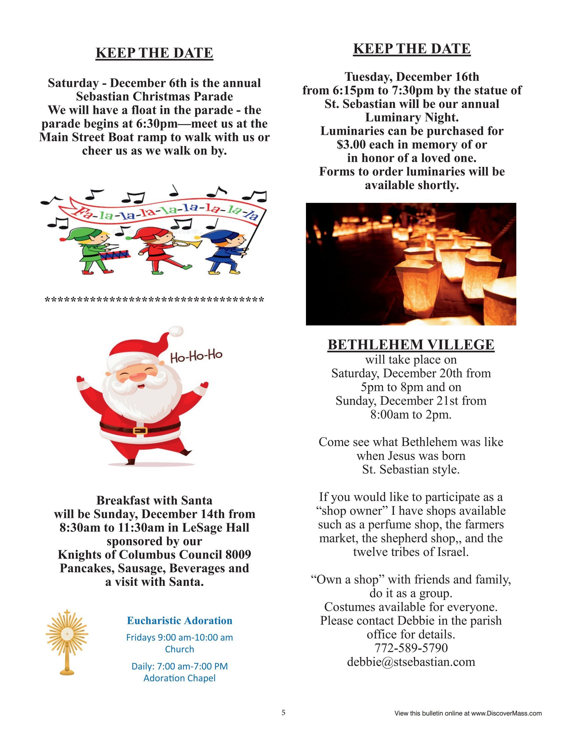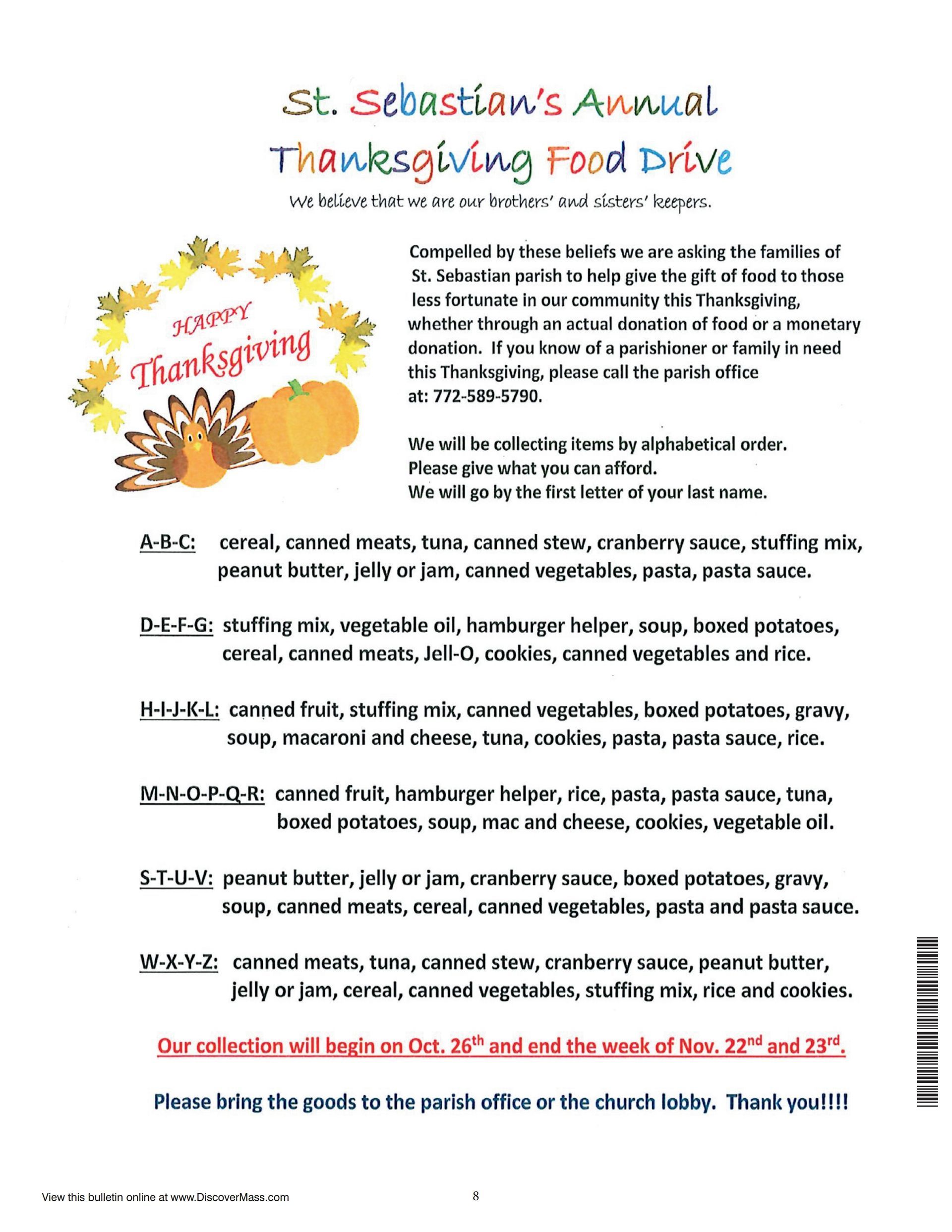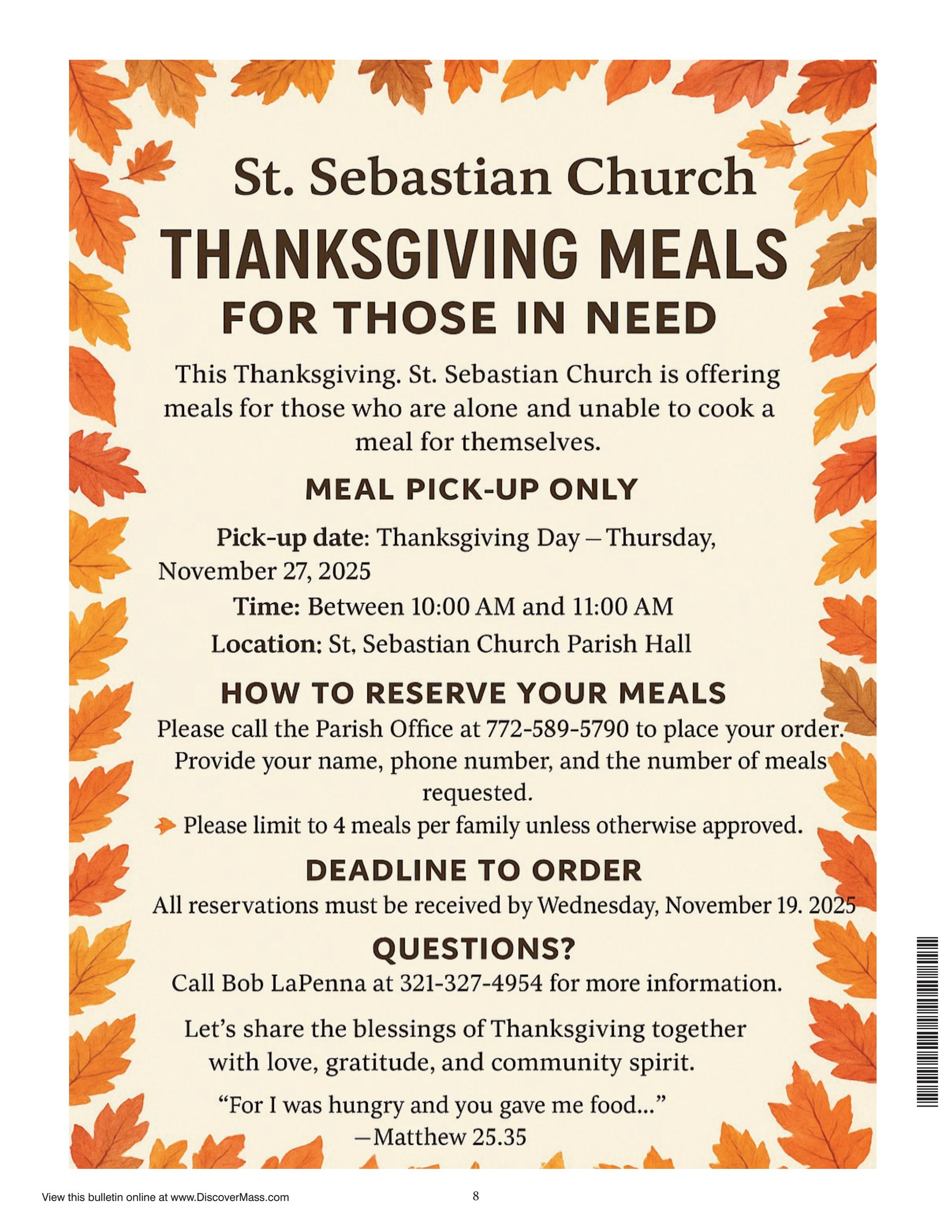 The parish is in need of ushers for the 7:30am and 11:30am Masses. If you attend either of these Masses and would like to help, please call Sandy in the parish office at 772-589-5790.