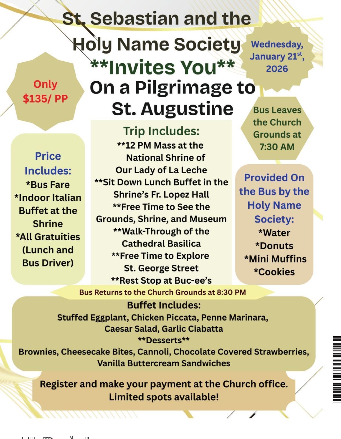 The Holy Name LogoConfraternity of the Most Holy Names of God and Jesus (Holy Name Society) promotes reverence for the Sacred Names of God and Jesus Christ, obedience and loyalty to the Magisterium of the Catholic Church, and the personal sanctification and holiness of its members. Members are called to contribute to the evangelization mission of the Church and to make perpetual acts of reverence and love for our Lord and Savior. The apostolate of the society is to assist in parish ministries by performing the Corporal Works of Mercy: to feed the hungry, to clothe the naked, give drink to the thirsty, shelter to the homeless, tend the sick, visit those in prison, and bury the dead; as well as the Spiritual Works of Mercy: to convert sinners, instruct the ignorant, counsel the wayward, comfort the sorrowing, bear adversity patiently, forgive offenses, and pray the living and the dead.